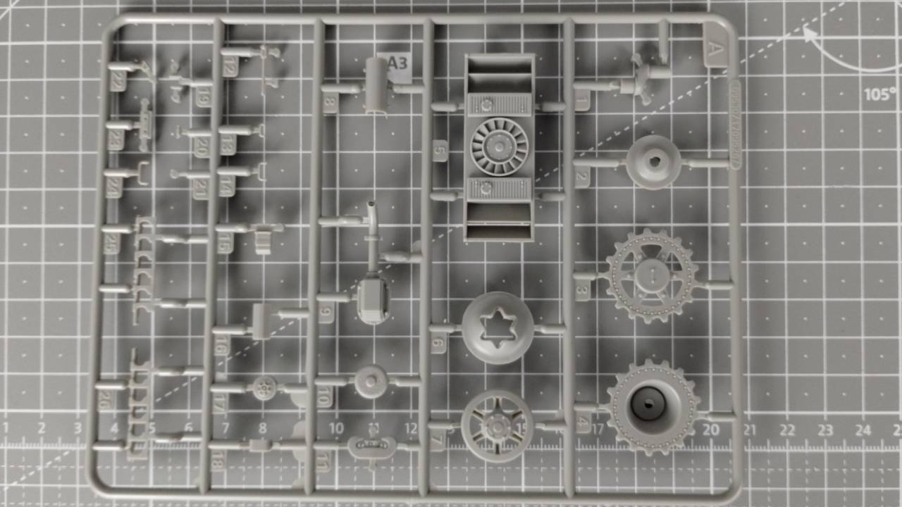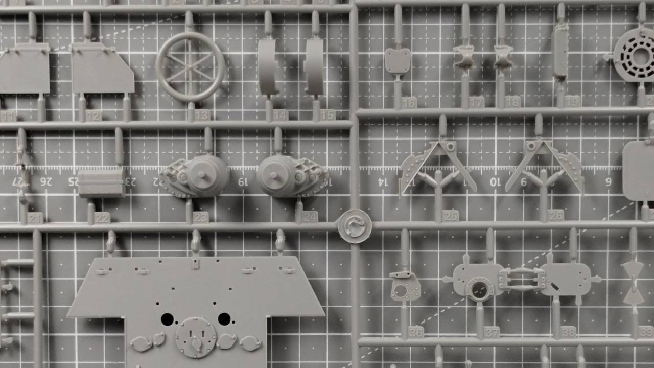 Niestety w zestawie nie znajdziemy żadnych kalkomanii, zapewne przez wzgląd na to, że mamy do czynienia tylko z prototypem. Od razu wyjaśnię, że wśród tych 21 wyprasek aż pięć jest dedykowana elementom, z których zbudujemy gąsienice, natomiast kolejne cztery wypraski zawierają elementy zawieszenia łącznie z kołami. Koniec końców zgodnie z informacją zamieszczoną na pudełku, cały model składa się z ponad 1200 elementów.