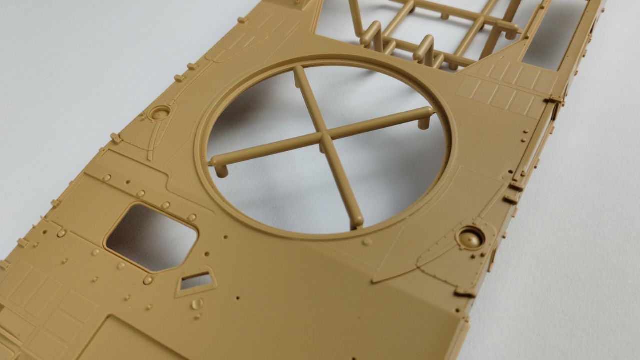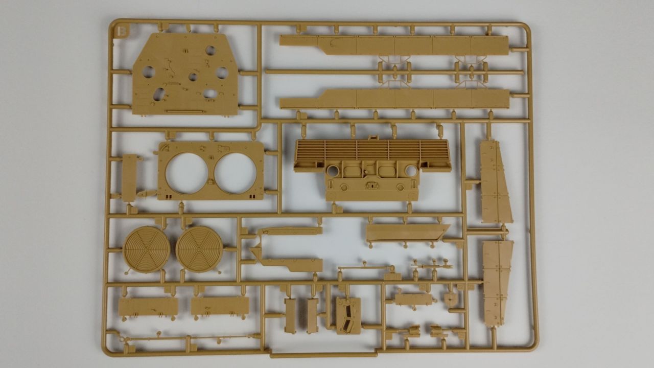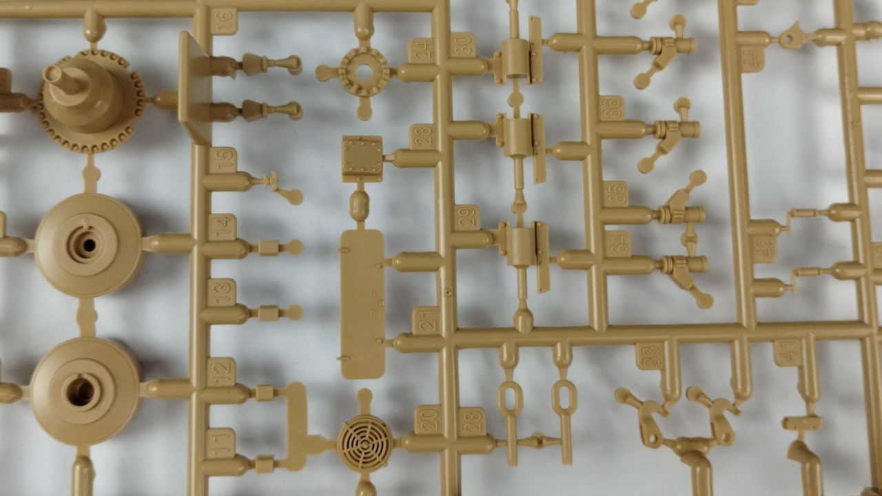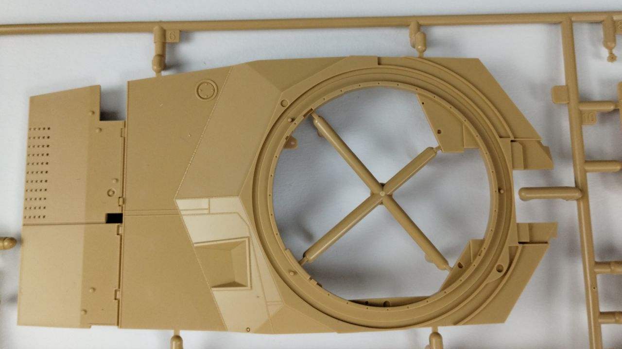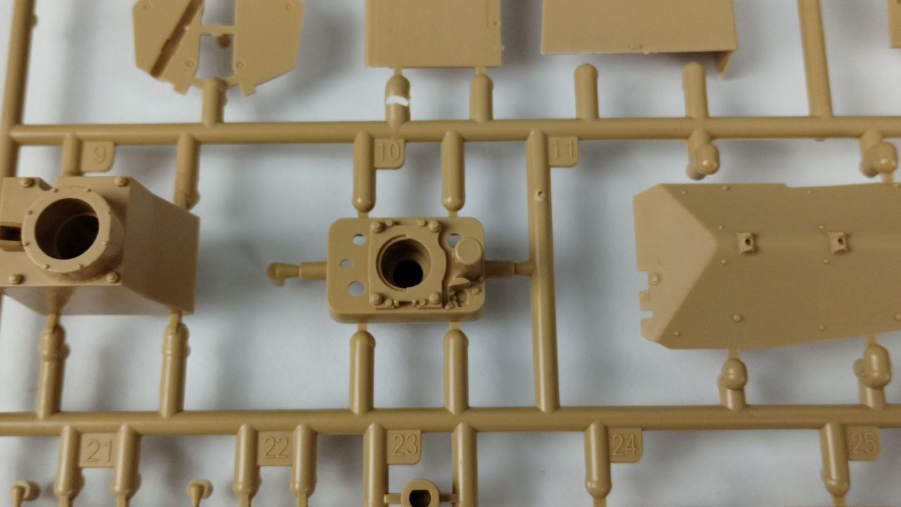Oprócz tego 3 wypraski są wypełnione elementami do gąsienic (mam nadzieję, że będzie się je składać lepiej niż te, które były w modelu Flakpanther). Kolejnymi elementami znajdującymi się w kartonie jest góra kadłuba oraz wieżyczka. Te dwa elementy są już wycięte i nie znajdują się w żadnych wypraskach. Oprócz samych wyprasek, w pudełku znajduje się 24 stronicowa instrukcja składania. Jeśli ilość stron Cię przeraża, to nie przejmuj się – cały proces składania zawarty jest na 21 stronach. Na te strony składa się 26 kroków składania. Reszta stron prezentuje wzory umieszczeń kalkomanii oraz szablony malowania.
