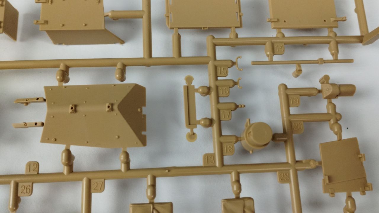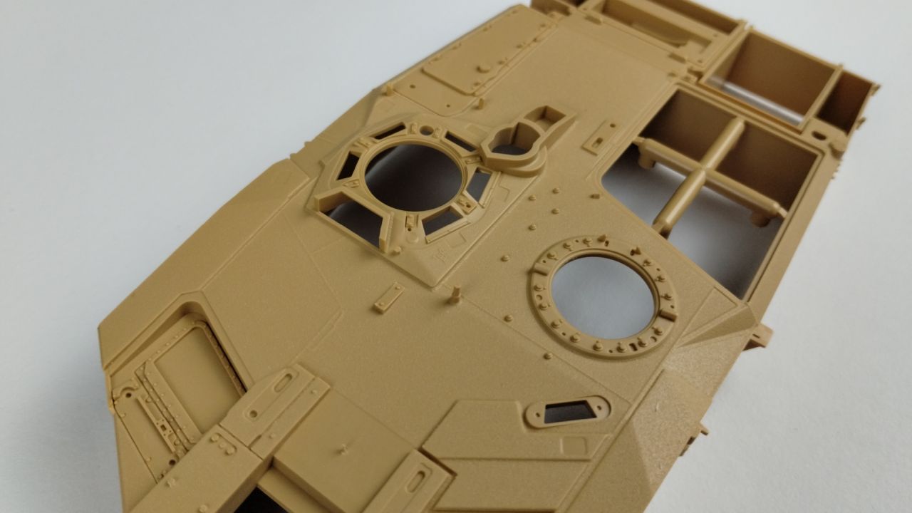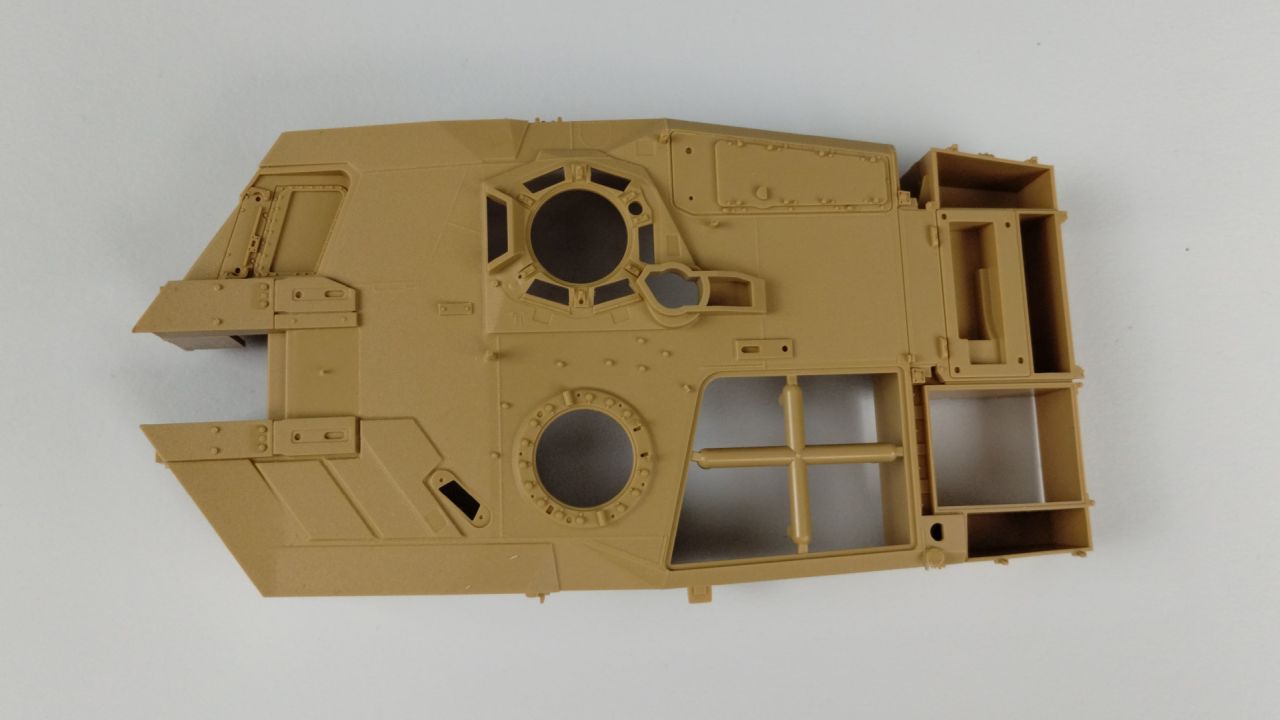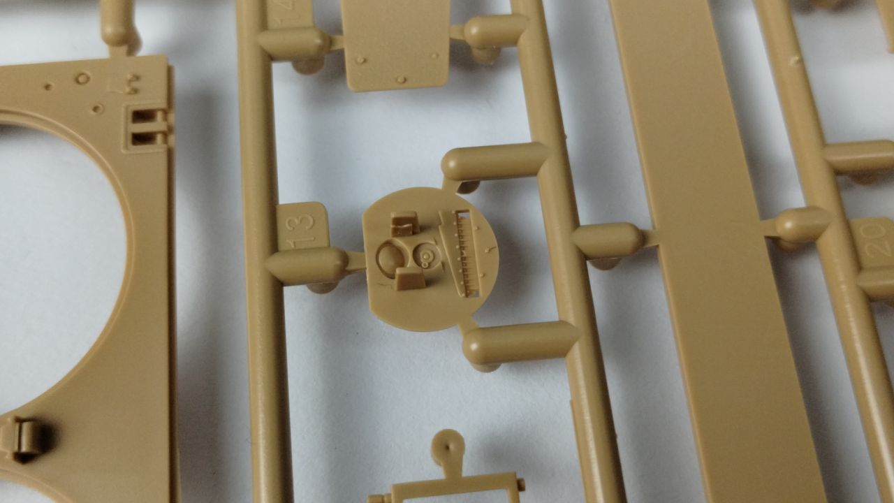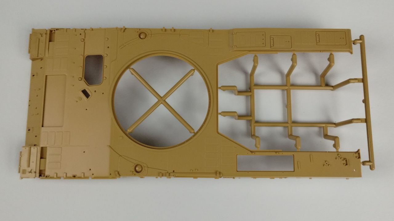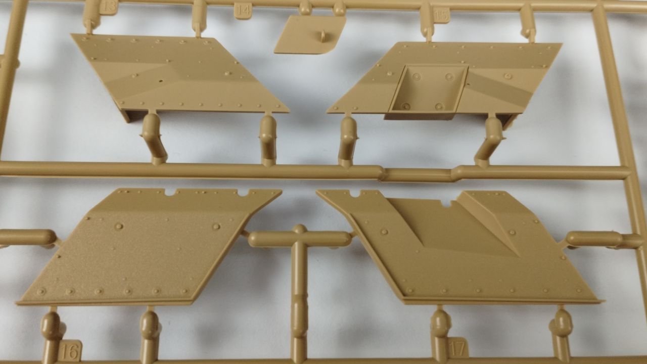 Oprócz tego 3 wypraski są wypełnione elementami do gąsienic (mam nadzieję, że będzie się je składać lepiej niż te, które były w modelu Flakpanther). Kolejnymi elementami znajdującymi się w kartonie jest góra kadłuba oraz wieżyczka. Te dwa elementy są już wycięte i nie znajdują się w żadnych wypraskach. Oprócz samych wyprasek, w pudełku znajduje się 24 stronicowa instrukcja składania. Jeśli ilość stron Cię przeraża, to nie przejmuj się – cały proces składania zawarty jest na 21 stronach. Na te strony składa się 26 kroków składania. Reszta stron prezentuje wzory umieszczeń kalkomanii oraz szablony malowania.