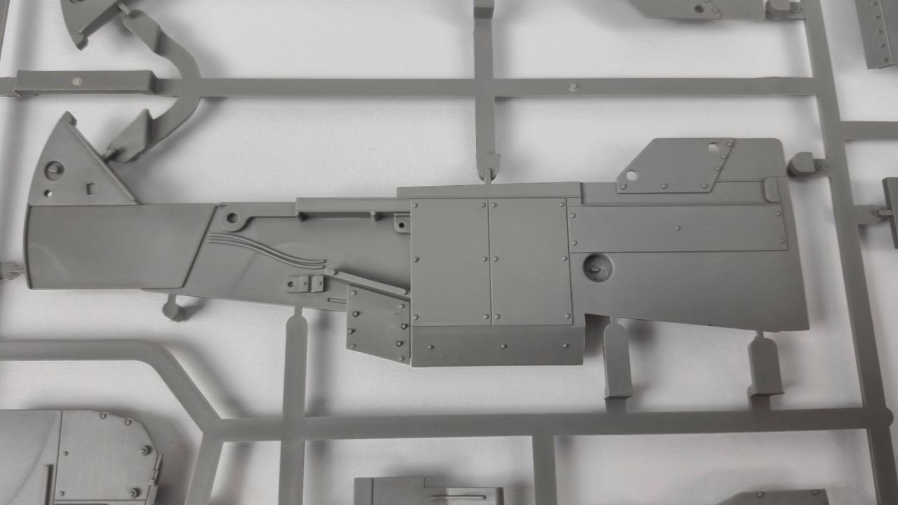 Wśród 13 szarych wyprasek znajdziemy podwójną wypraskę „E”, która zawiera koło zębate oraz drobne detale modelu (w tym szekle). 4 wypraski „D”, gdzie znajdziesz elementy do budowy kół oraz 4 wypraski „H”, w których znalazły się same wypustki do gąsienic. W trzech największych wypraskach znalazło się miejsce na największe elementy modelu, w tym na łychę, burty oraz górną część kadłuba.